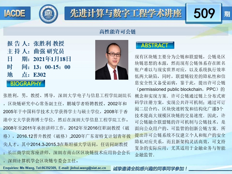 大家好!先进计算与数字工程学术讲座第509期将于1月18日 13:00-15:00在E302举行,本次讲座将邀请深圳大学 张胜利 教授作题为“高性能许可公链”的报告。本次报告将由数字所曲强 研究员主持,诚挚邀请大家参加、学习和交流!