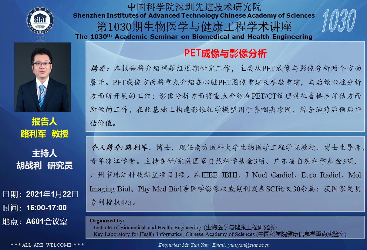 大家好!医工所将于2021年1月22日(周五)下午16:00-17:00,在A601会议室举办第1030期生物医学与健康工程学术讲座,特邀 南方医科大学 路利军教授 作题为“PET成像与影像分析”的学术报告。诚挚邀请大家参加学习和交流!
