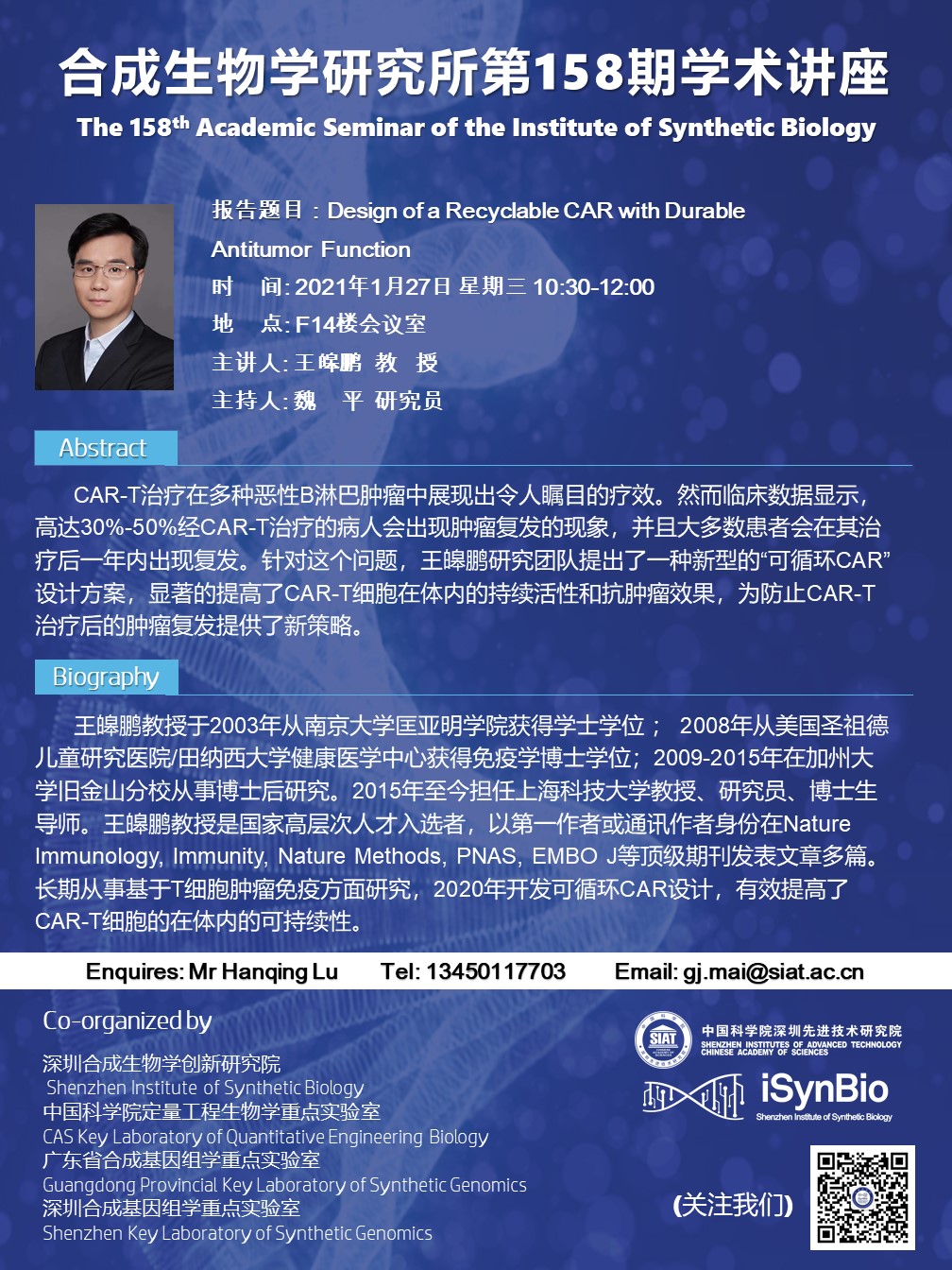 本次讲座邀请了 上海科技大学 王皞鹏 教授 带来题为“ Design of a Recyclable CAR with Durable Antitumor Function ”的报告。