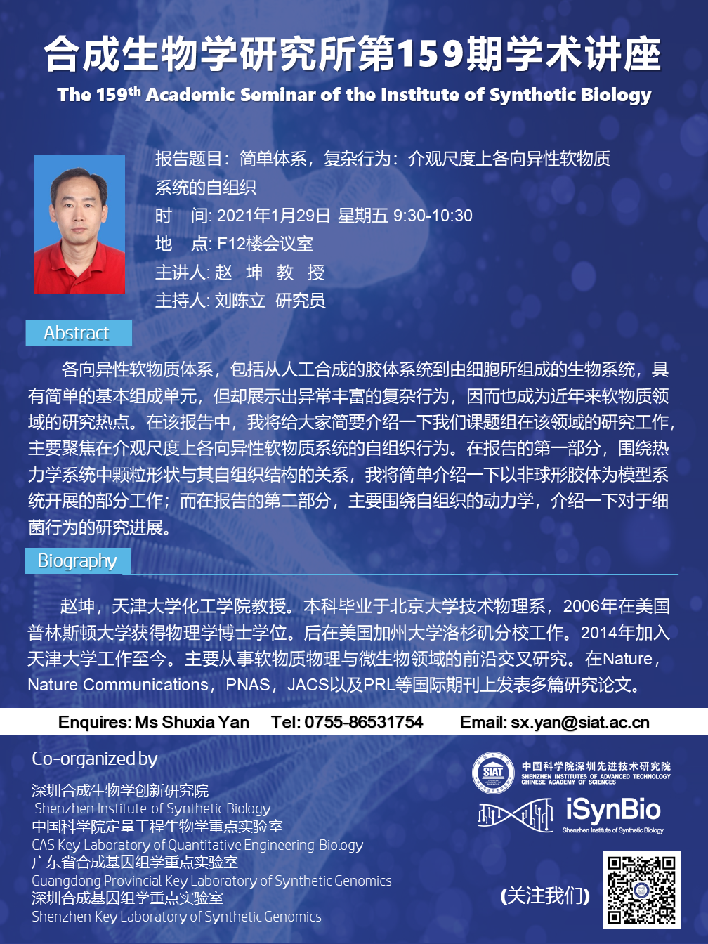 本次讲座邀请了 天津大学 赵坤 教授 带来题为“ 简单体系,复杂行为:介观尺度上各向异性软物质系统的自组织 ”的报告。