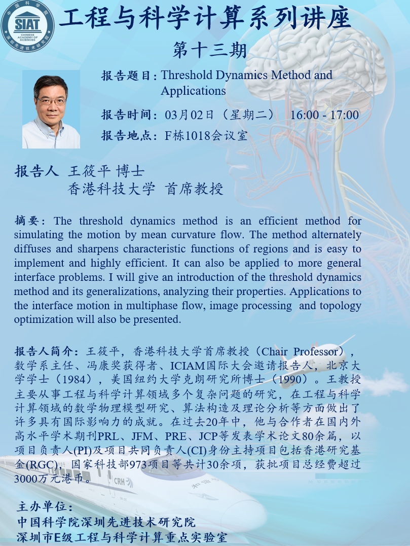 大家好!数字所工程与科学计算系列讲座第十三期将于3月2日 16:00-17:00在F栋1018会议室举行,本次讲座将邀请香港科技大学 王筱平 首席教授作题为“Threshold Dynamics Method and Applications”的报告。诚挚邀请大家参加、学习和交流!
