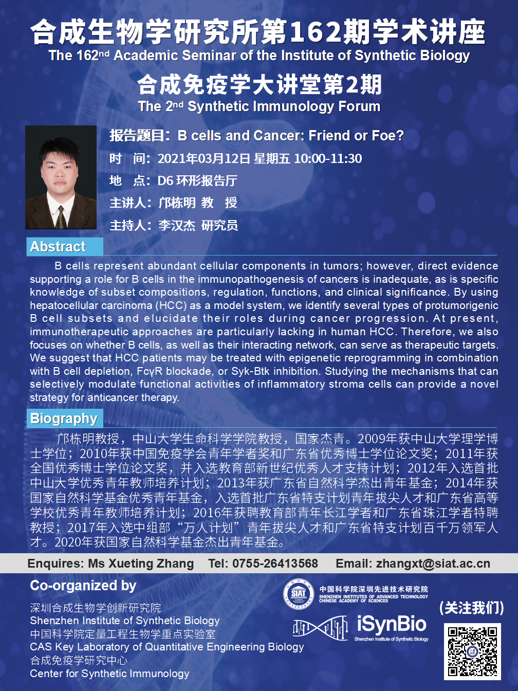 合成所第162期学术讲座暨合成免疫学大讲堂第二期将于 2021年3月12日(本周五)10:00-11:30 在D6环形报告厅进行。