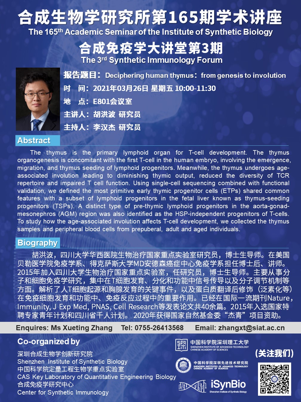 本次讲座邀请了 四川大学华西医院生物治疗国家重点实验室 胡洪波 研究员 带来题为“Deciphering human thymus:from genesis to involution”的报告。