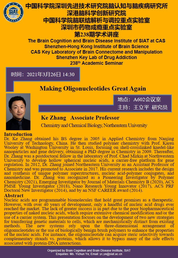 本次讲座由Northeastern University,张可副教授作题为“Making Oligonucleotides Great Again”的专题报告。