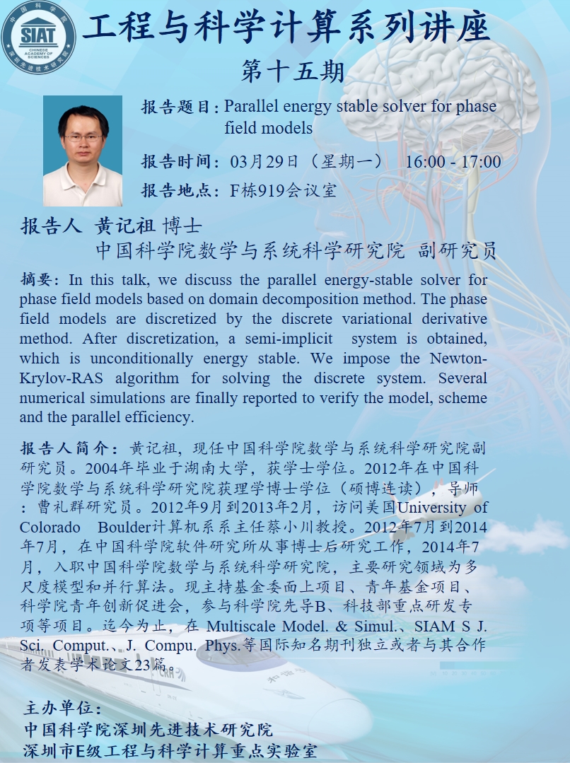 大家好!数字所工程与科学计算系列讲座第十五期将于3月29日 16:00-17:00在F栋919会议室举行,本次讲座将邀请中国科学院数学与系统科学研究院 黄记祖 副研究员作题为“Parallel energy stable solver for phase field models”的报告。诚挚邀请大家参加、学习和交流!