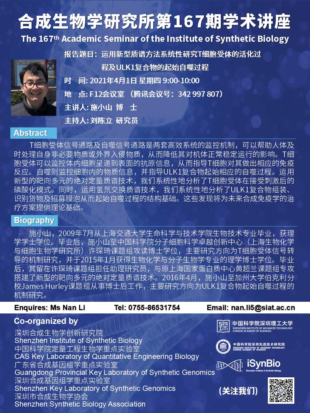 本次讲座邀请了 加州大学伯克利分校 施小山 博士 带来题为“运用新型质谱方法系统性研究T细胞受体的活化过程及ULK1复合物的起始自噬过程”的报告。
