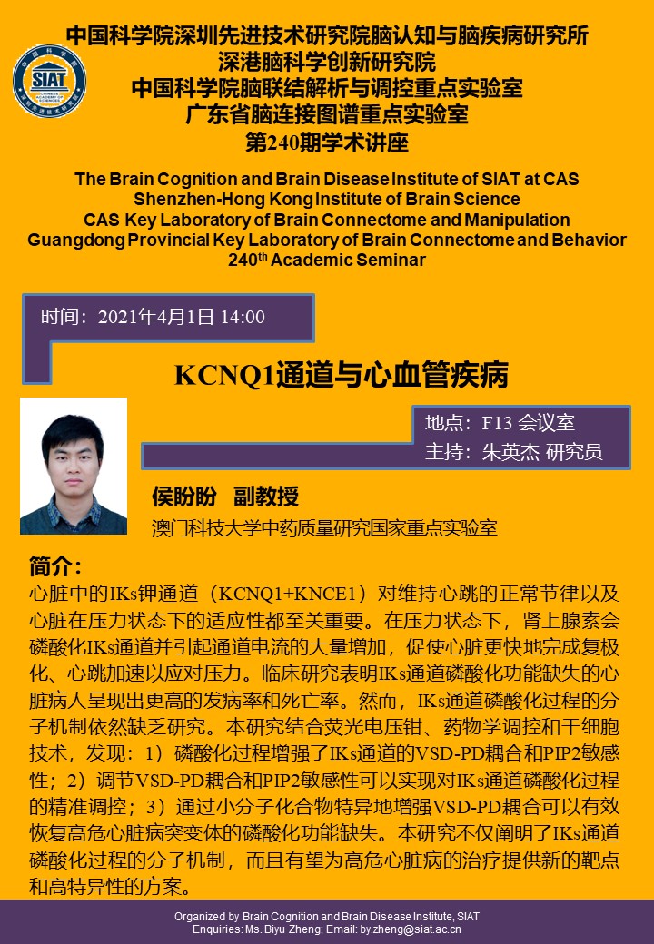 本次讲座由 澳门科技大学中药质量研究国家重点实验室,侯盼盼副教授 作题为“KCNQ1通道与心血管疾病 ”的专题报告。