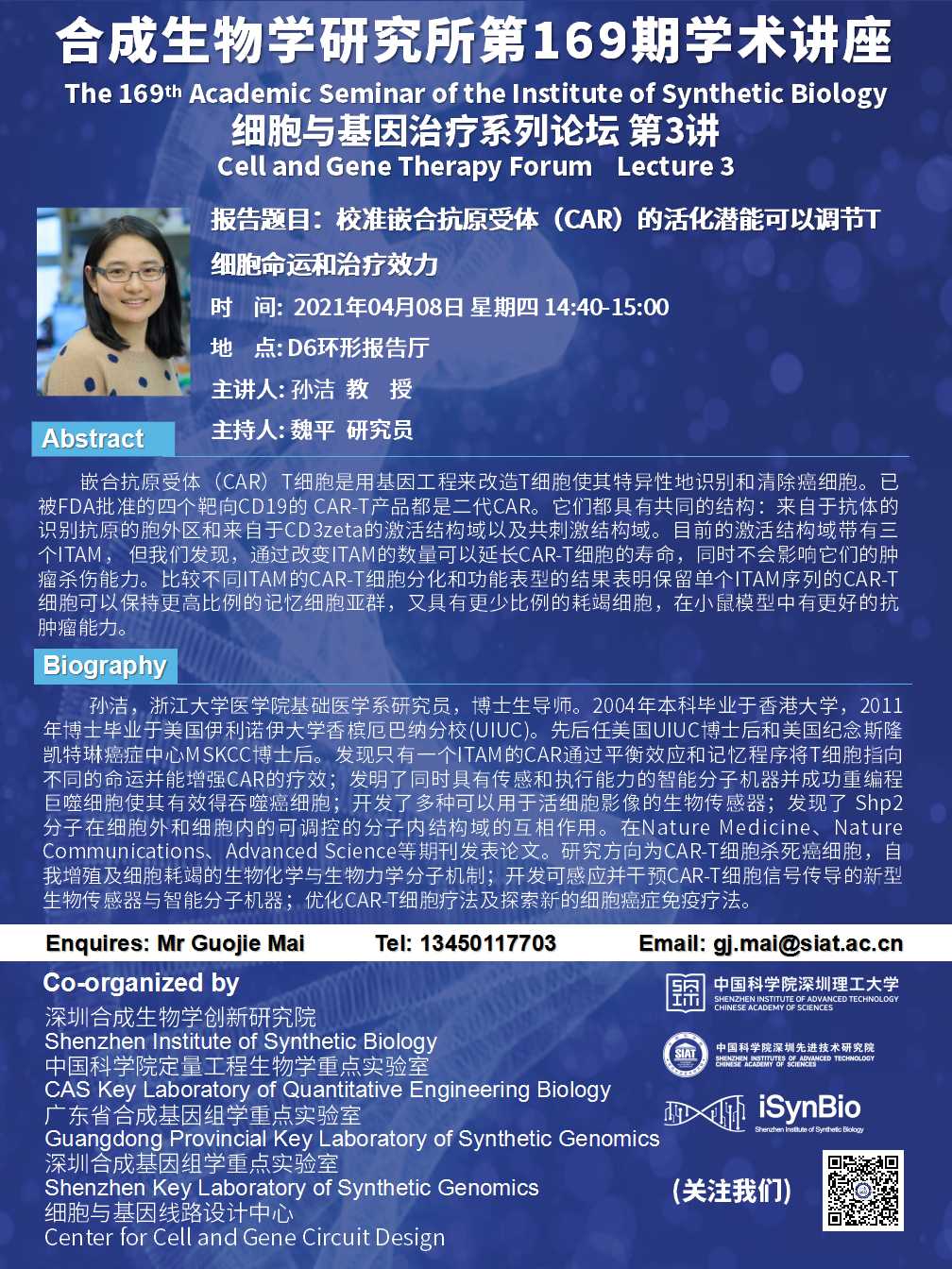 合成所第169期学术讲座暨细胞与基因治疗系列论坛第3讲将于 2021年4月8日(周四)14:40-15:00 在D6环形报告厅进行。