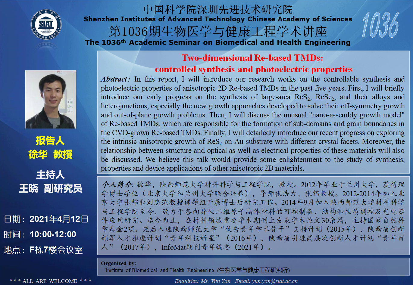 大家好!医工所将于2021年4月12日(周一)上午10:00-12:00,在F栋7楼会议室举办第1036期生物医学与健康工程学术讲座,特邀 陕西师范大学 徐华教授 作题为“Two-dimensional Re-based TMDs: controlled synthesis and photoelectric properties”的学术报告。诚挚邀请大家参加学习和交流!