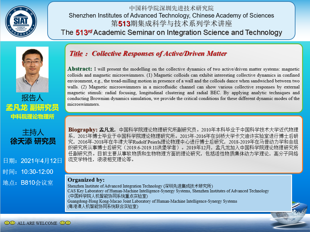 集成所第513期集成科学与技术系列学术讲座将于4月12日(周一)上午10:30-12:00在B810会议室召开。本次讲座特邀中国科学院理论物理研究所的孟凡龙副研究员作题为《Collective Responses of Active/Driven Matter》的学术报告。
