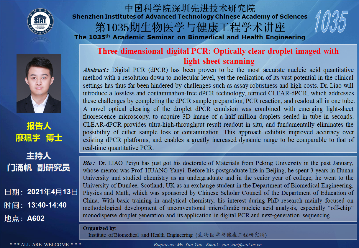 大家好!医工所将于2021年4月13日(周二)下午13:40-14:40,在A602会议室举办第1035期生物医学与健康工程学术讲座,特邀 北京大学 廖珮宇博士 作题为“Three-dimensional digital PCR: Optically clear droplet imaged with light-sheet scanning”的学术报告。诚挚邀请大家参加学习和交流!