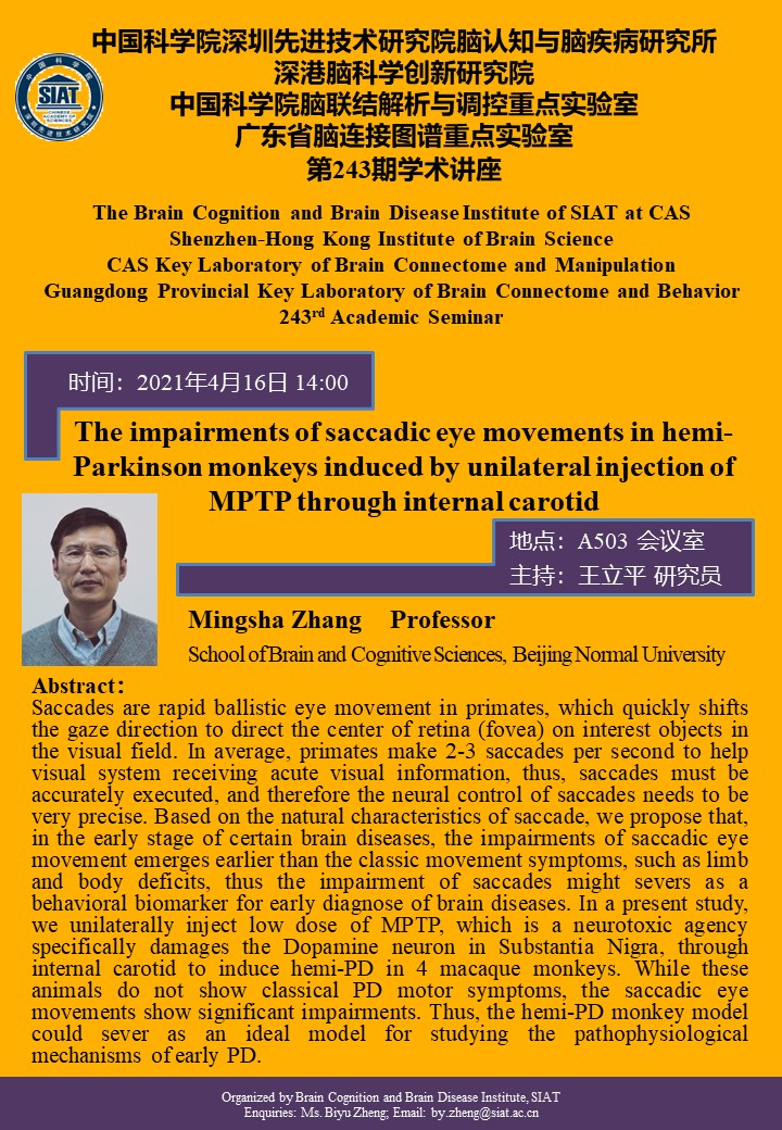 本次讲座由北京师范大学脑与认知科学研究院,张鸣沙教授作题为“The impairments of saccadic eye movements in hemi-Parkinson monkeys induced by unilateral injection of MPTP through internal carotid”的专题报告。