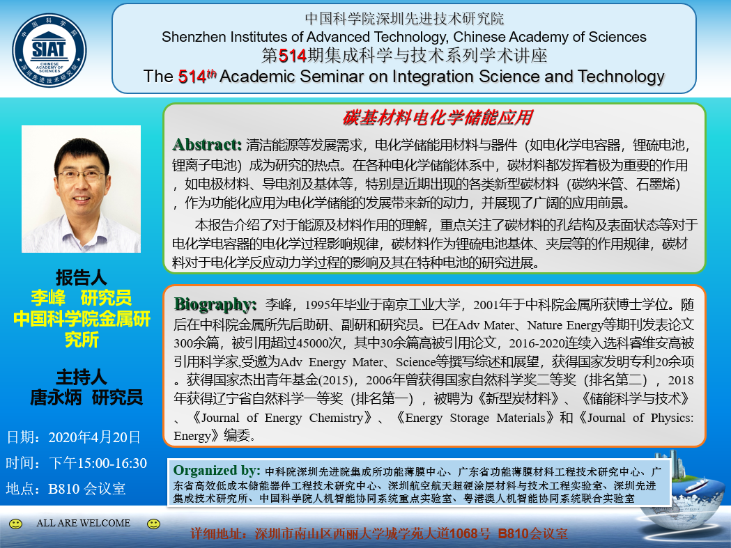 集成所第514期集成科学与技术系列学术讲座将于4月20日(周二)下午15:00-16:30在B810会议室召开。本次讲座特邀中国科学院金属研究所的李峰研究员作题为《碳基材料电化学储能应用》的学术报告。