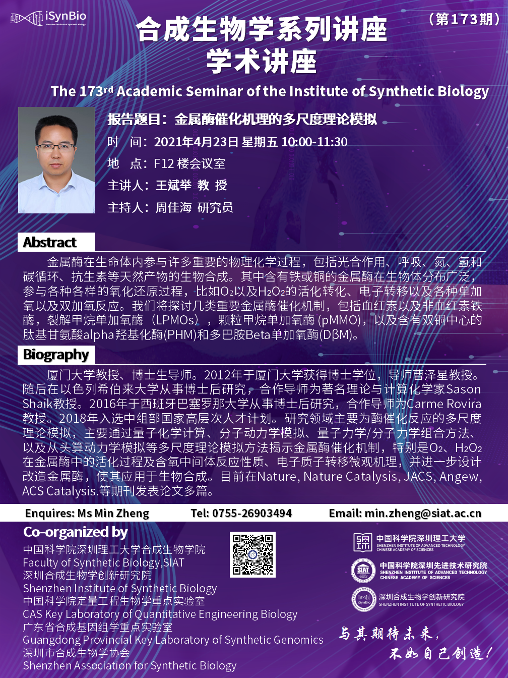 合成所第173期学术讲座将于 2021年04月23日(周五)10:00-11:30 在F12楼会议室进行。