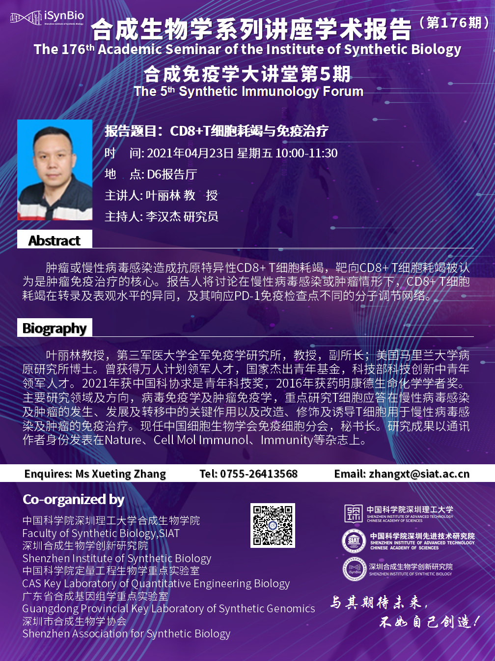 合成所第176期学术讲座暨合成免疫学大讲堂第5期将于 2021年04月23日(周五)10:00-11:30 在D6报告厅进行。
