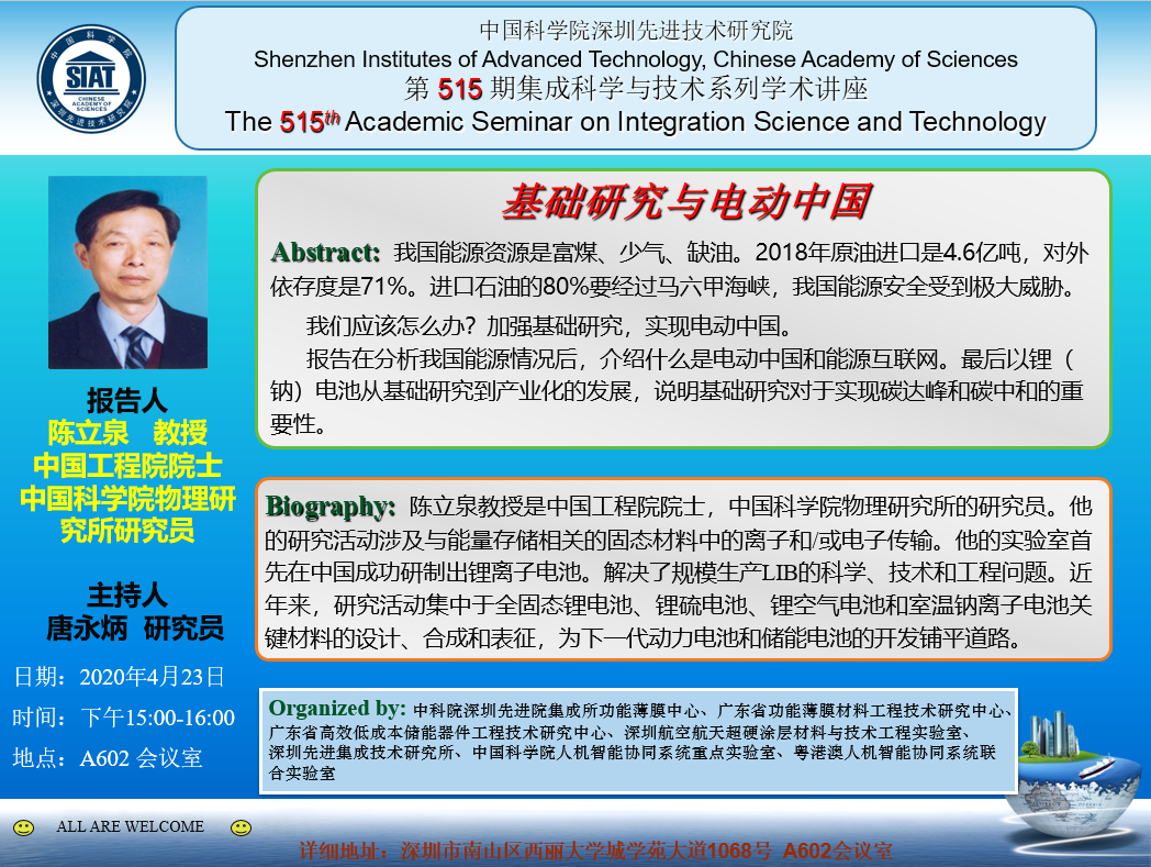 集成所第515期集成科学与技术系列学术讲座将于4月23日(周五)下午15:00-16:00在A602会议室召开。本次讲座特邀中国科学院物理研究所的陈立泉教授作题为《基础研究与电动中国》的学术报告。