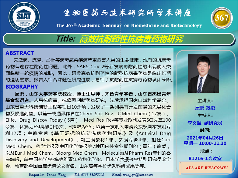 医药所第367期学术讲座将于2021年04月26日 星期一 10:00-11:30 在先进院 B1216-1会议室举行。本次讲座邀请了来自山东大学药学院,展鹏 教授带来“高效抗耐药性抗病毒药物研究”的报告。届时,李文军 副研究员将主持讲座。