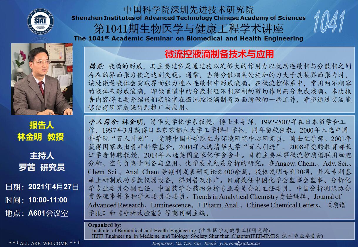 大家好!医工所将于2021年4月27日(周二)上午10:00-11:00,在A601会议室举办第1041期生物医学与健康工程学术讲座,特邀 清华大学 林金明教授 作题为“微流控液滴制备技术与应用”的学术报告。诚挚邀请大家参加学习和交流!