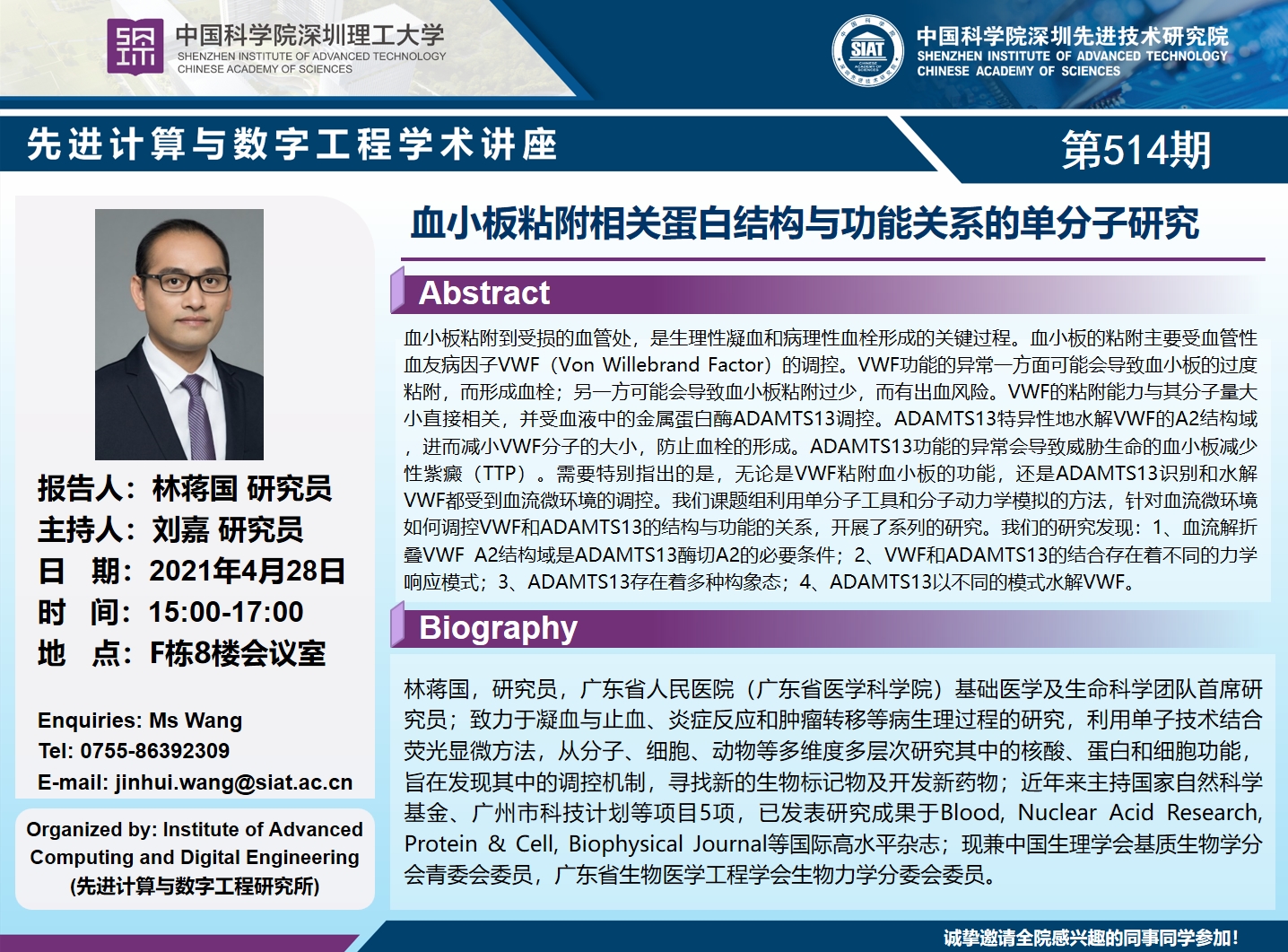 大家好!先进计算与数字工程学术讲座第514期将于4月28日 15:00-17:00在F栋8楼会议室举行,本次讲座将邀请广东省人民医院 林蒋国 研究员作题为“血小板粘附相关蛋白结构与功能关系的单分子研究”的报告。本次报告将由数字所刘嘉 研究员主持,诚挚邀请大家参加、学习和交流!