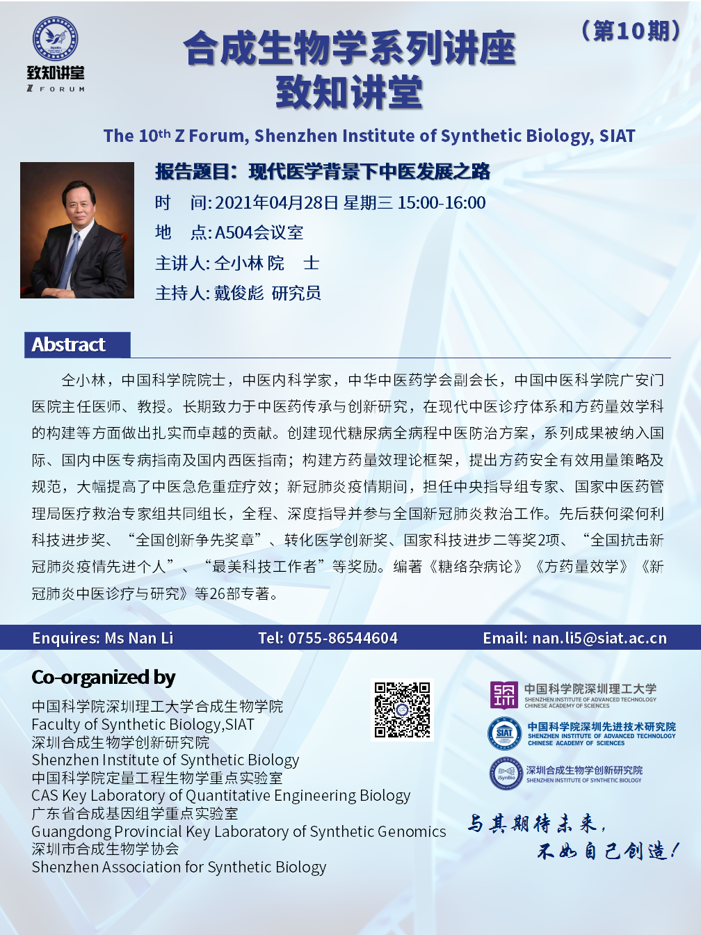 合成生物学研究所/深圳合成生物学创新研究院“致知讲堂”第十期将于 2021年04月28日(周三)15:00-16:00 在 A504报告厅 进行。