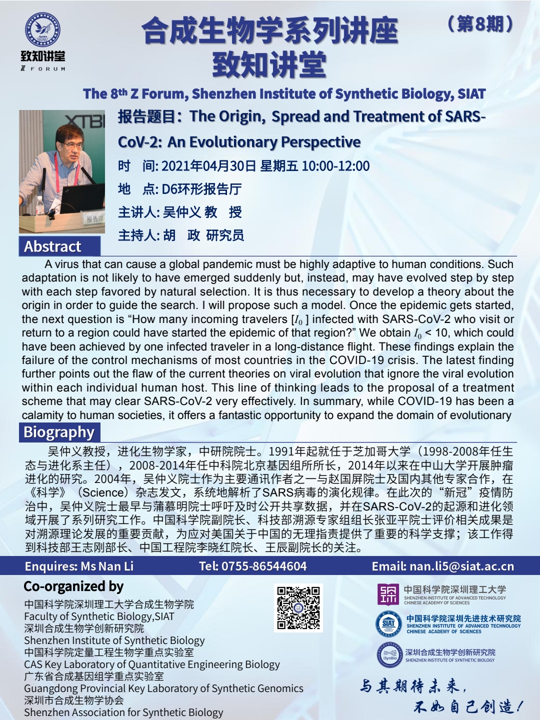 本次讲座邀请了 中山大学 吴仲义 教授 带来题为“The Origin, Spread and Treatment of SARS-CoV-2: An Evolutionary Perspective”的报告。
