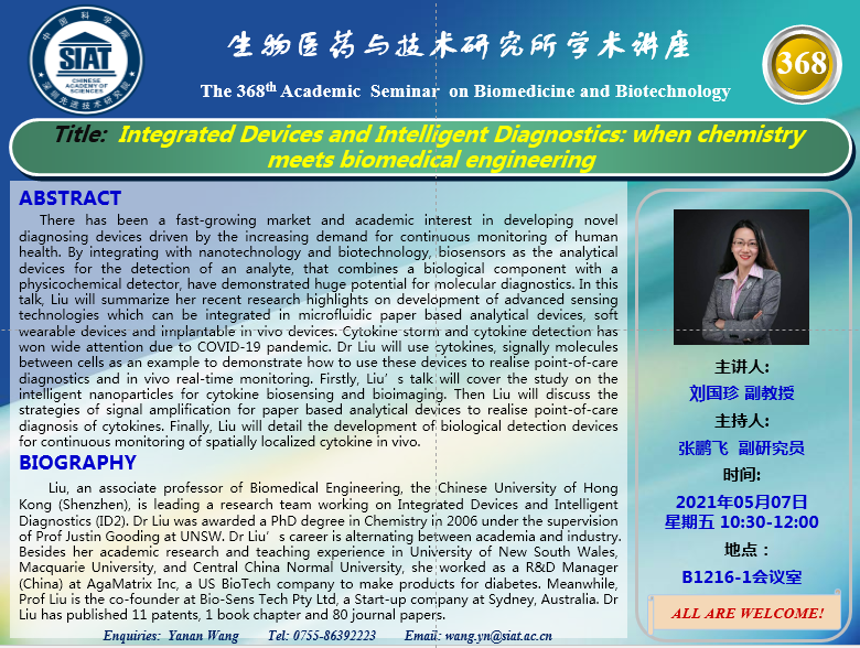 医药所第368期学术讲座将于2021年05月07日 星期五 10:30-12:00 在先进院 B1216-1会议室举行。本次讲座邀请了来自香港中文大学(深圳),刘国珍 副教授带来“Integrated Devices and Intelligent Diagnostics: when chemistry meets biomedical engineering”的报告。届时,张鹏飞 副研究员将主持讲座。