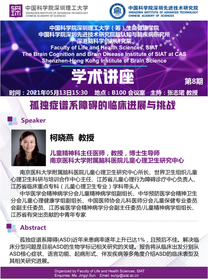 生命健康学院将于2021年5月13日15:30,在B100会议室举办第八期学术讲座。南京医科大学附属脑科医院柯晓燕教授将带来孤独症谱系障碍的临床进展与挑战专题讲座。