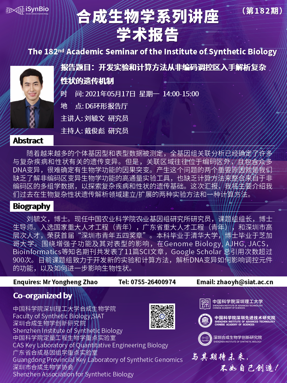【2021年5月17日 合成所】开发实验和计算方法从非编码调控区入手解析复杂性状的遗传机制