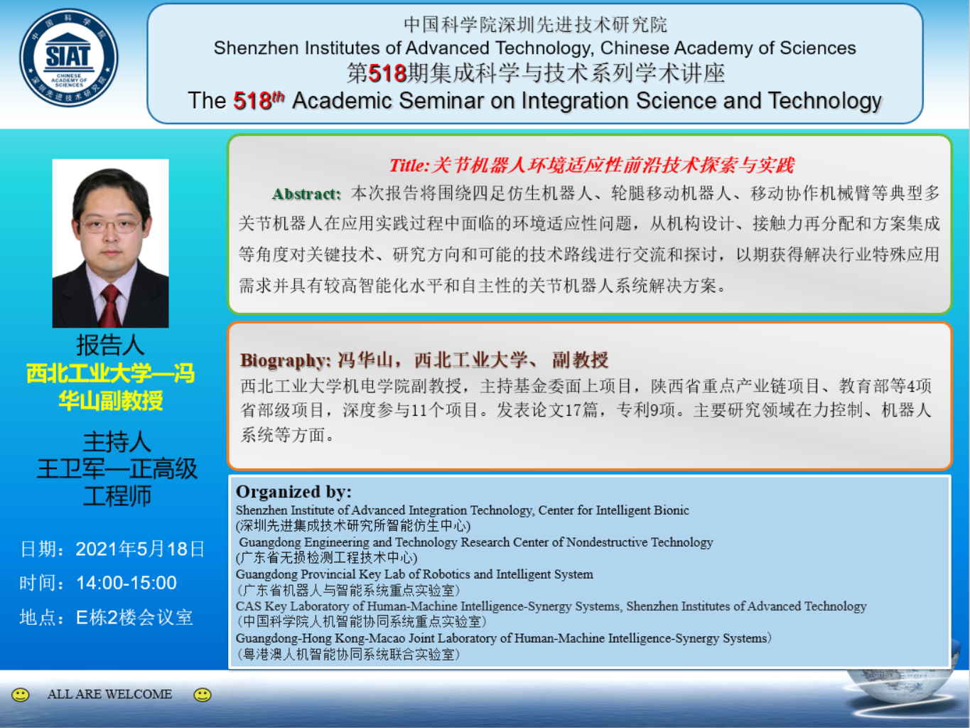 集成所第518期集成科学与技术系列学术讲座将于5月18日(周二)下午14:00-15:00在E栋2楼会议室召开。本次讲座特邀西北工业大学的冯华山副教授作题为《关节机器人环境适应性前沿技术探索与实践》的学术报告。
