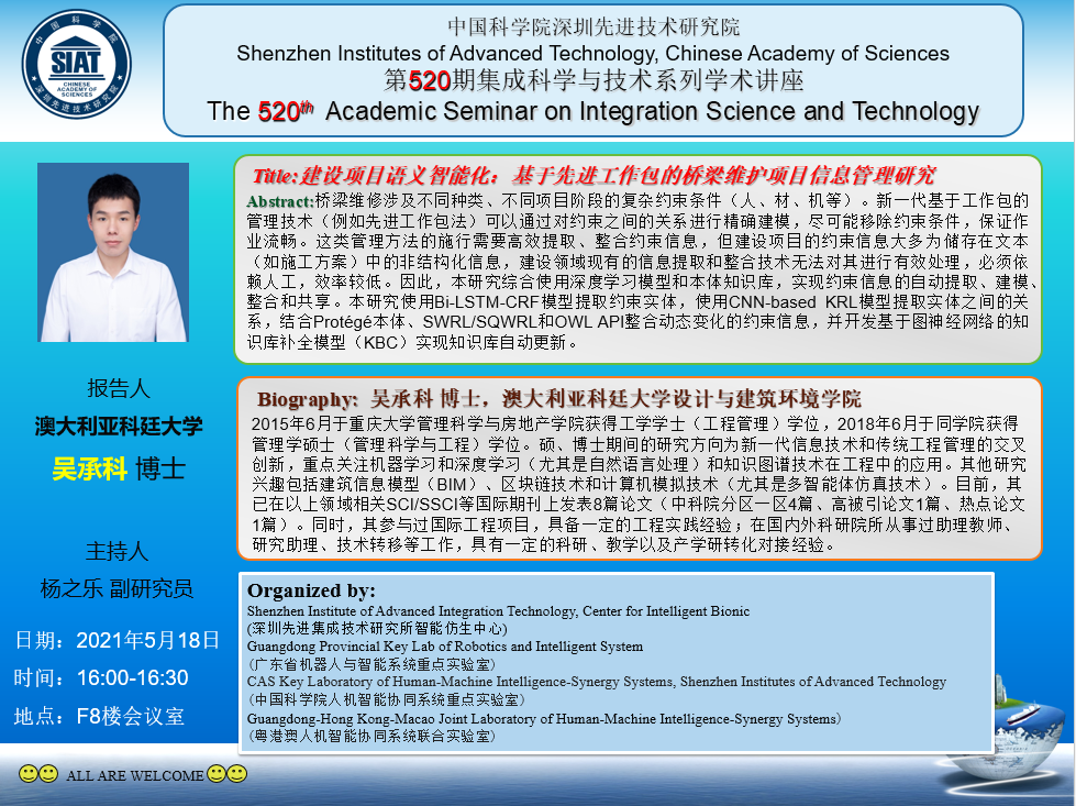 集成所第520期集成科学与技术系列学术讲座将于5月18日(周二)下午16:00-16:30在F栋8楼会议室召开。本次讲座特邀澳大利亚科廷大学的吴承科博士作题为《建设项目语义智能化:基于先进工作包的桥梁维护项目信息管理研究》的学术报告。