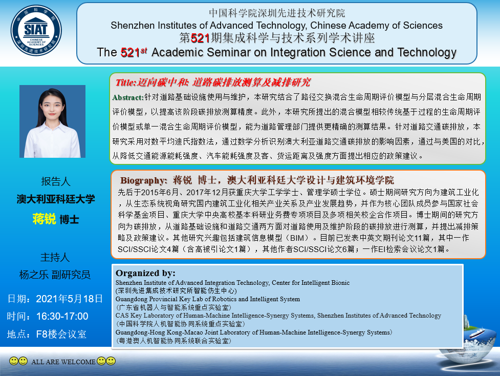 集成所第521期集成科学与技术系列学术讲座将于5月18日(周二)下午16:30-17:00在F栋8楼会议室召开。本次讲座特邀澳大利亚科廷大学的蒋锐博士作题为《迈向碳中和:道路碳排放测算及减排研究》的学术报告。