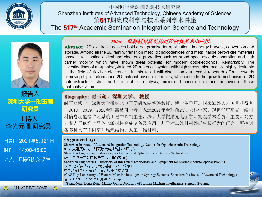 集成所第517期集成科学与技术系列学术讲座将于5月21日(周五)下午14:00-15:00在F栋6楼会议室召开。本次讲座特邀深圳大学的时玉荫研究员作题为《二维材料异质结构可控制备及广电应用》的学术报告。