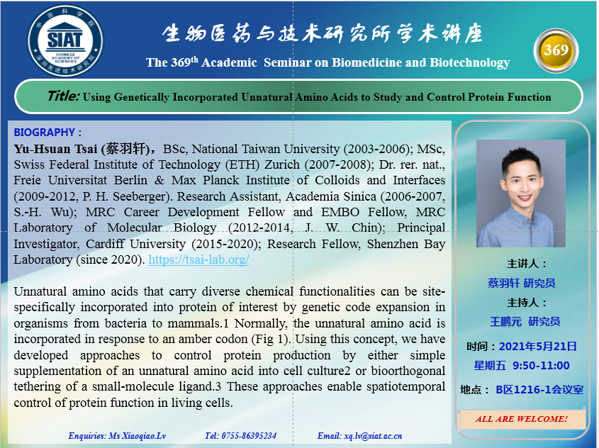 医药所第369期学术讲座将于2021年05月21日 星期五 9:50-11:00 在先进院 B1216-1会议室举行。本次讲座邀请了来自深圳湾实验室,蔡羽轩 研究员带来“Using Genetically Incorporated Unnatural Amino Acids to Study and Control Protein Function”的报告。届时,王鹏元 研究员将主持讲座。