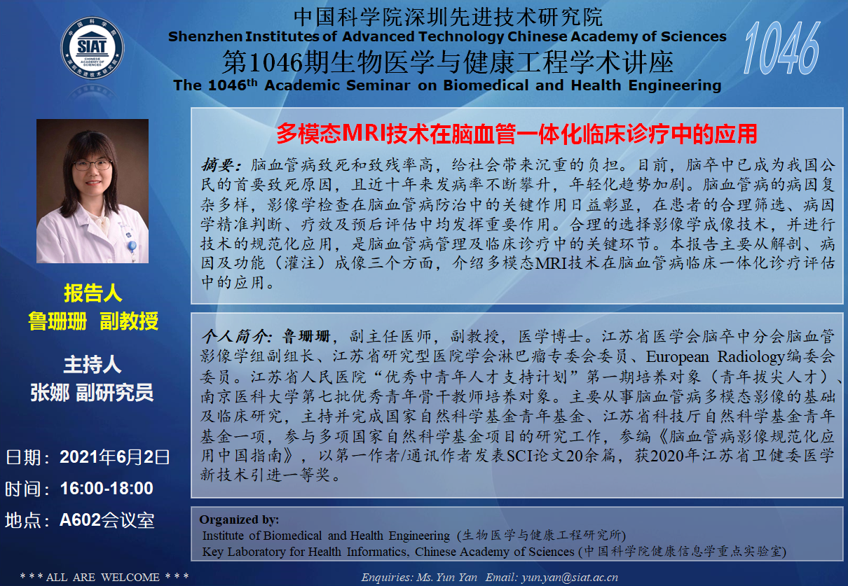 大家好!医工所将于2021年6月2日(周三)下午16:00-18:00,在A602会议室举办第1046期生物医学与健康工程学术讲座,特邀 江苏省人民医院 鲁珊珊 副教授 作题为“多模态MRI技术在脑血管一体化临床诊疗中的应用”的学术报告。诚挚邀请大家参加学习和交流!