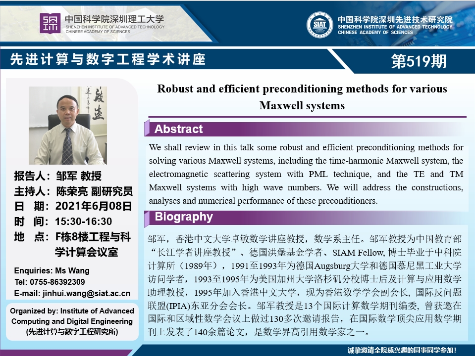 大家好!先进计算与数字工程学术讲座第519期将于6月8日15:30-16:30在F栋8楼会议室(802对面)举行,本次讲座将邀请香港中文大学 邹军 讲座教授作题为“Robust and efficient preconditioning methods for various Maxwell systems”的报告。本次报告将由数字所陈荣亮 副研究员主持,诚挚邀请大家参加、学习和交流!