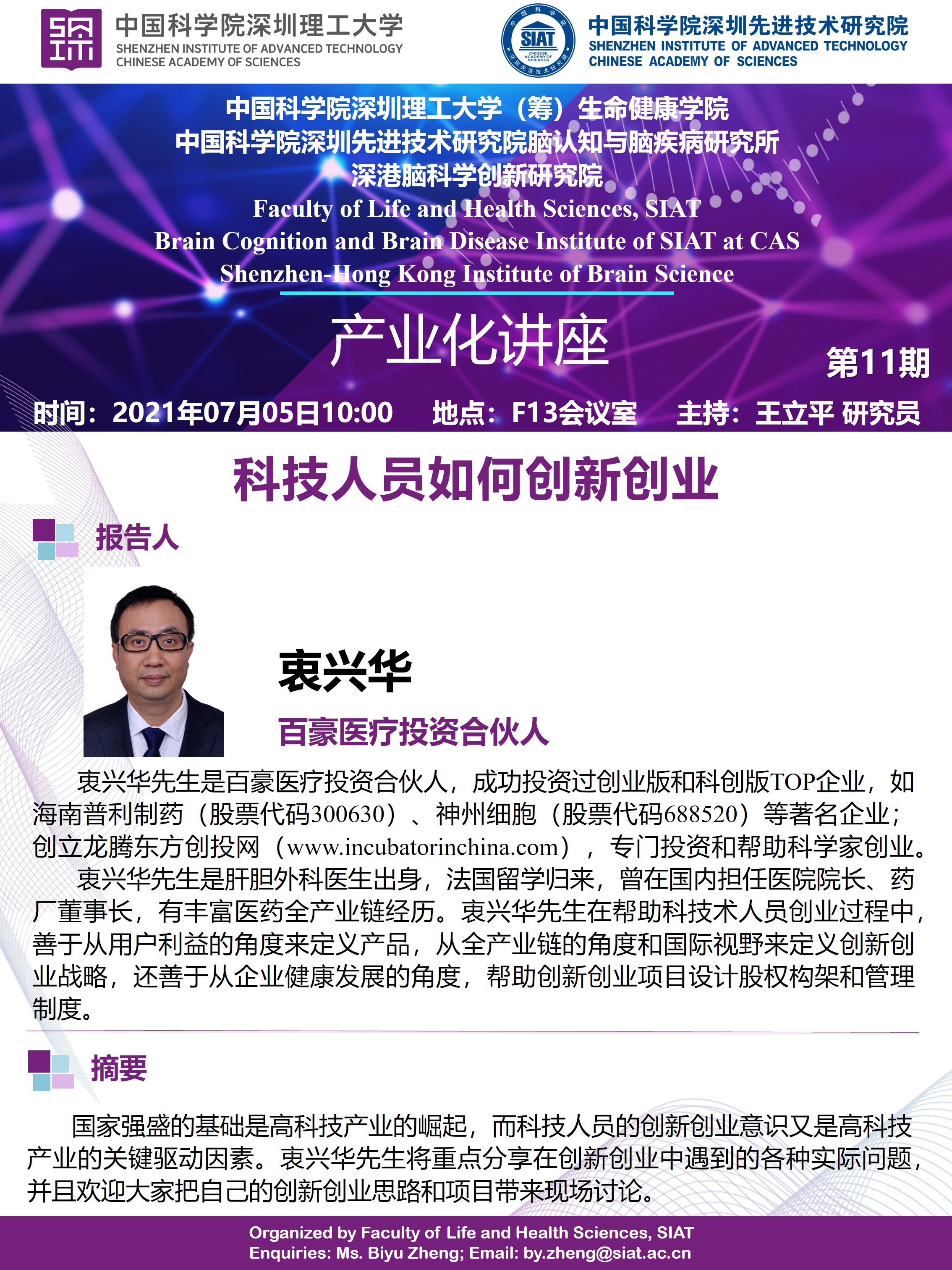 生命健康学院 脑所将于2021年07月05日10:00,在F13会议室举办第十一期学术讲座。百豪医疗投资合伙人,衷兴华将带来科技人员如何创新创业专题讲座。