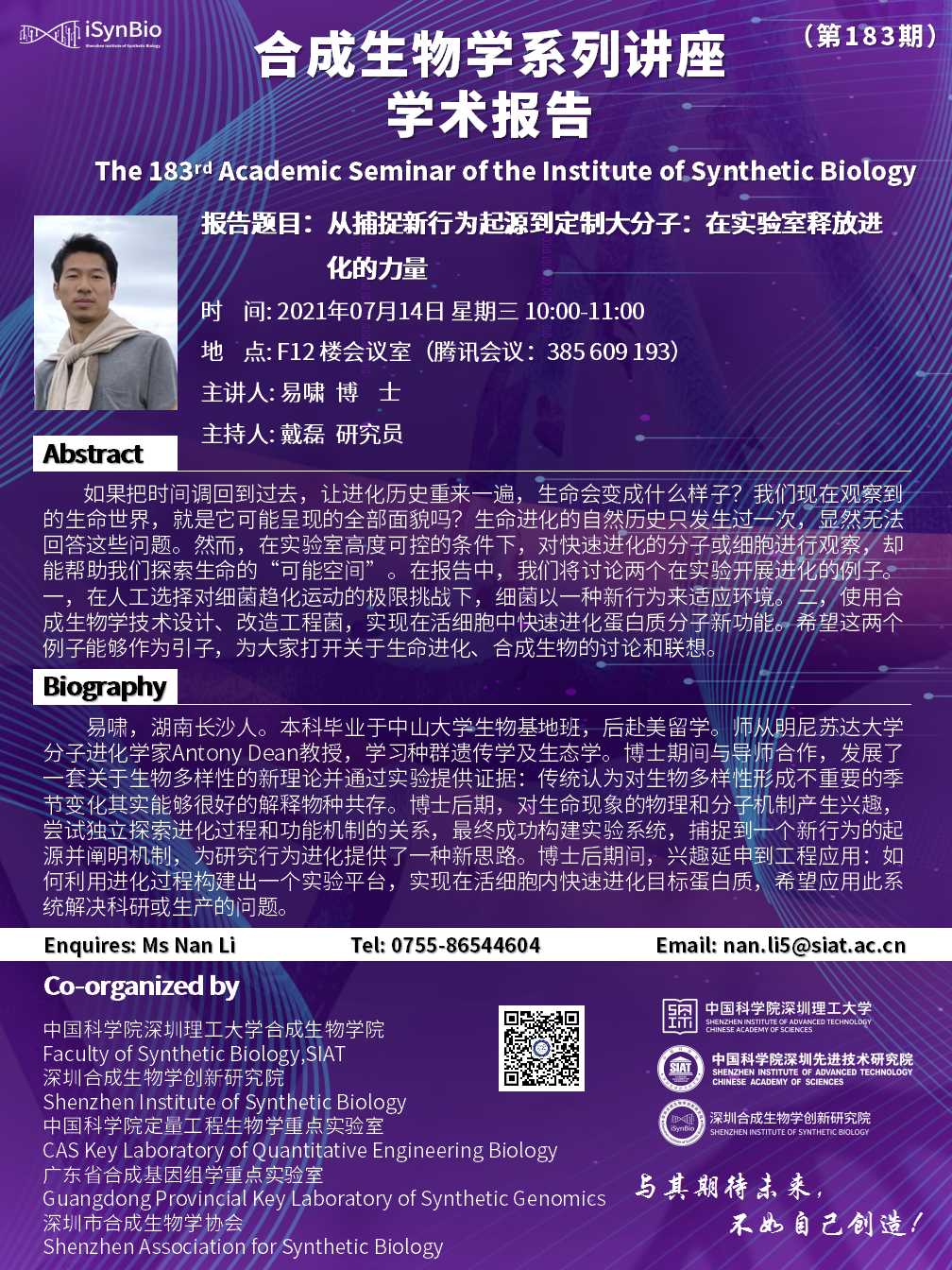 合成所/合成生物学院第183期学术讲座将于 2021年7月14日(周三)10:00-11:00 在 F12会议室 进行,腾讯会议:385 609 193。