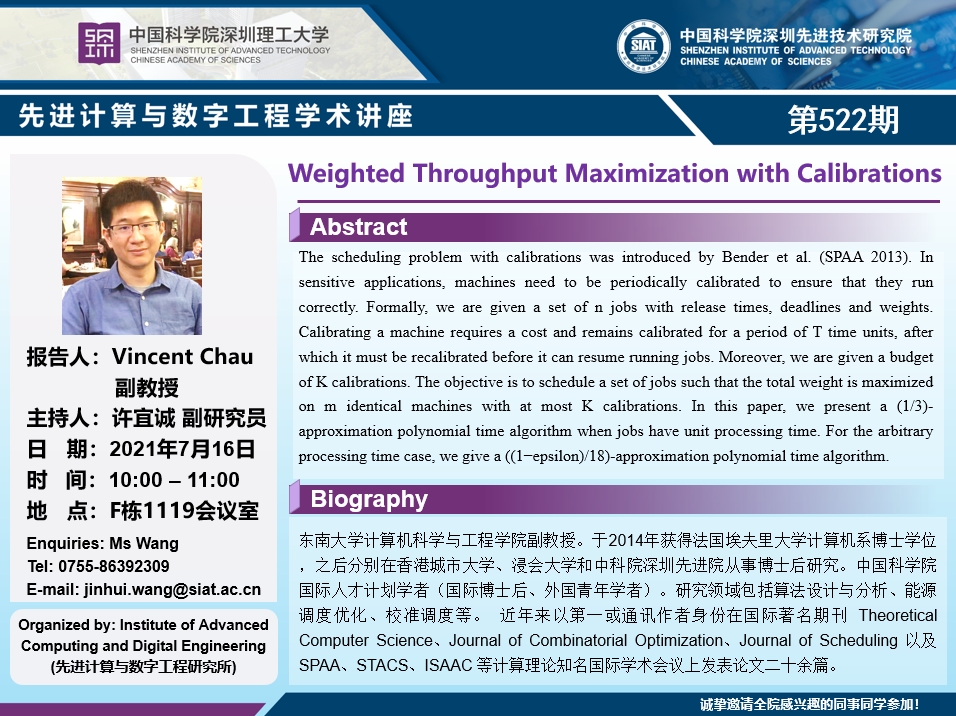 大家好!先进计算与数字工程学术讲座第522期将于7月16日10:00-11:00在F栋1119会议室举行,本次讲座将邀请东南大学 Vincent Chau 副教授作题为“Weighted Throughput Maximization with Calibrations ”的报告。本次报告将由数字所许宜诚 副研究员主持,诚挚邀请大家参加、学习和交流!