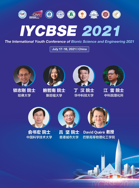 由中国科学院深圳先进技术研究院与香港城市大学、吉林大学、湖北大学联合承办的国际仿生工程学会青年委员会2021年学术年会(IYCBSE2021,会议网址:https://isbe-2021.scimeeting.cn/en/web/index/11420_) 拟于2021年7月17-18日(早上8:30 开始)在线上举行,中科院深圳先进院医工所 杜学敏 研究员为本次大会联席主席 (Co-Chair)。本次会议特别邀请到包括锁志刚院士、鲍哲南院士、丁汉院士、江雷院士、俞书宏院士、吕坚院士、David Quéré教授在内的130余位各领域国内外知名专家学者做特邀报告。热烈欢迎院内老师、同学们参加、学习和交流。