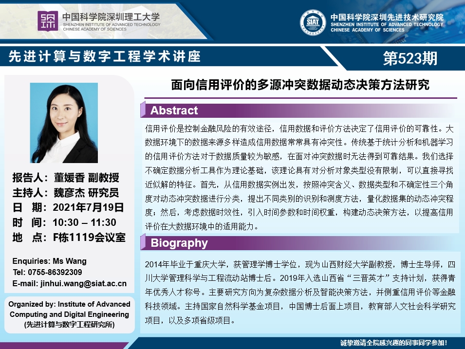 大家好!先进计算与数字工程学术讲座第523期将于7月19日10:30-11:30在F栋1119会议室举行,本次讲座将邀请山西财经大学 董媛香 副教授作题为“面向信用评价的多源冲突数据动态决策方法研究”的报告。本次报告将由数字所魏彦杰 研究员主持,诚挚邀请大家参加、学习和交流!