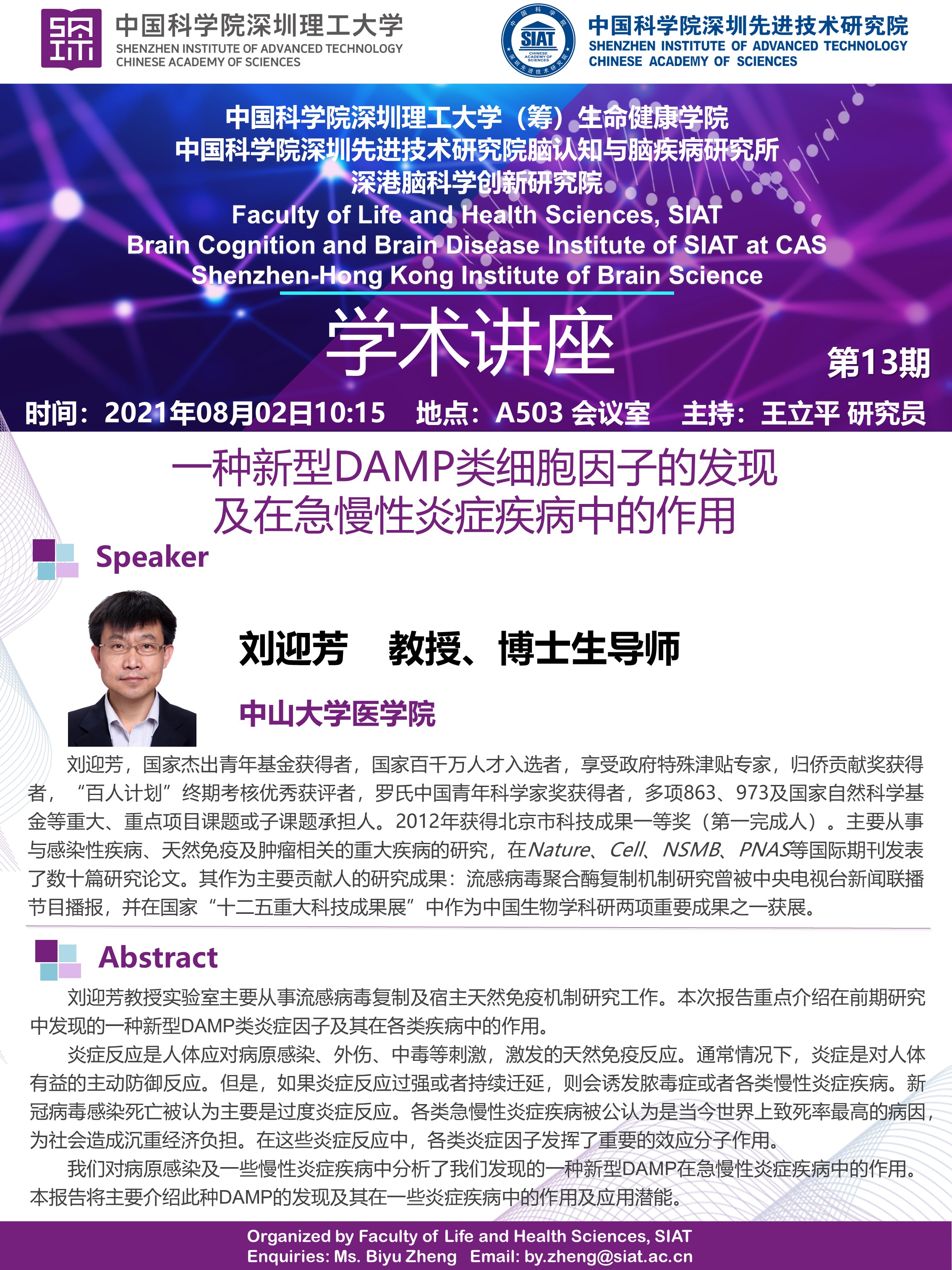 生命健康学院 脑所将于2021年08月02日10:15,在A503会议室举办第十三期学术讲座。中山大学医学院,刘迎芳教授将带来 一种新型DAMP类细胞因子的发现 及在急慢性炎症疾病中的作用 专题讲座。