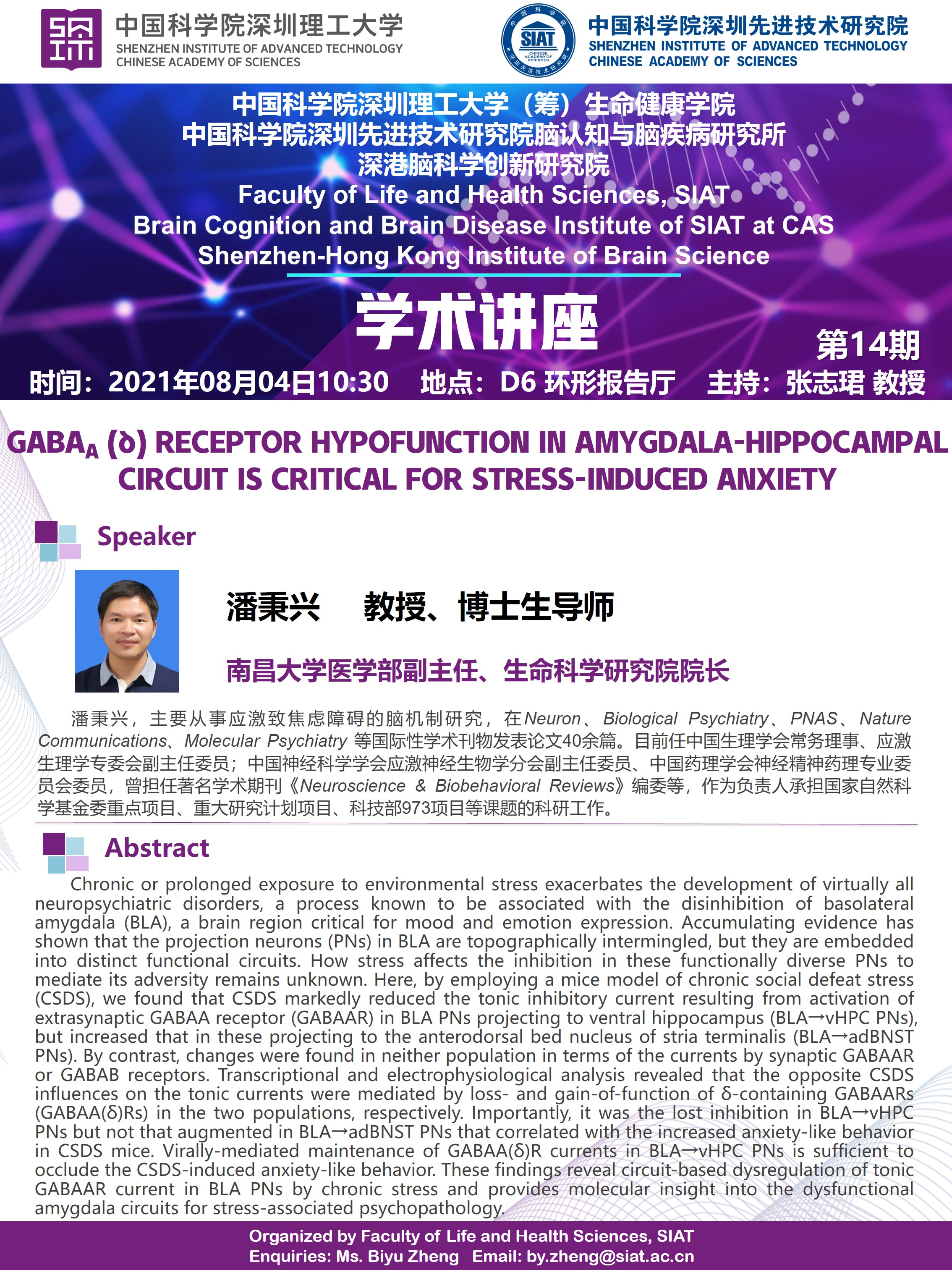 生命健康学院、脑所将于2021年08月04日10:30,在D6环形报告厅举办第十四期学术讲座。南昌大学,潘秉兴教授将带来“GABAA (δ) RECEPTOR HYPOFUNCTION IN AMYGDALA-HIPPOCAMPAL CIRCUIT IS CRITICAL FOR STRESS-INDUCED ANXIETY”专题讲座。