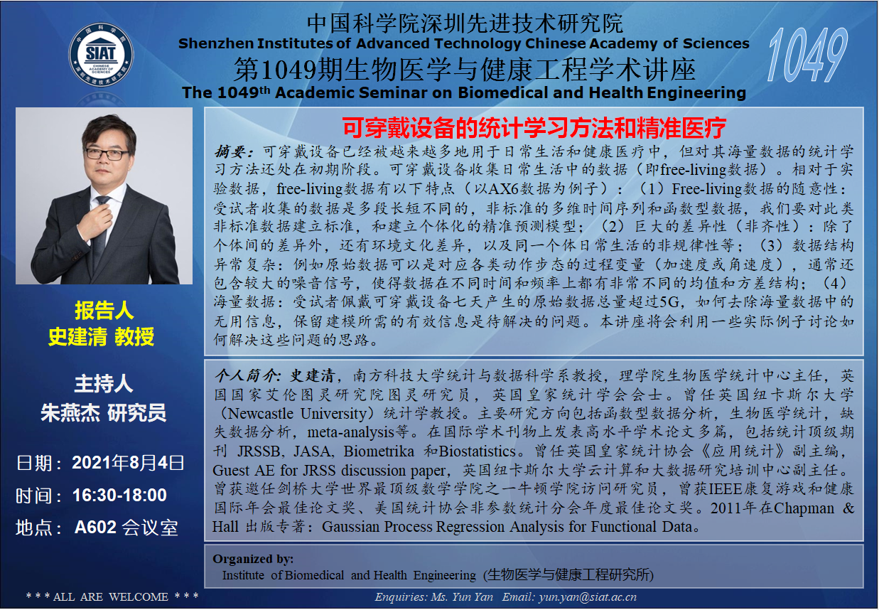 大家好!医工所将于2021年8月4日(周三)16:30-18:00,在A602会议室举办第1049期生物医学与健康工程学术讲座,特邀 南方科技大学 史建清 教授 作题为“可穿戴设备的统计学习方法和精准医疗”的学术报告。诚挚邀请大家参加学习和交流!