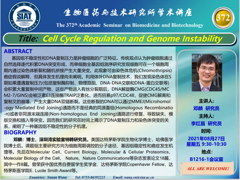 医药所第372期学术讲座将于2021年08月27日 星期五 9:30-10:30在先进院 B1216-1会议室举行。本次讲座邀请了来自深圳湾实验室,邓麟 研究员带来“Cell Cycle Regulation and Genome Instability”的报告。届时,李红昌 研究员将主持讲座。