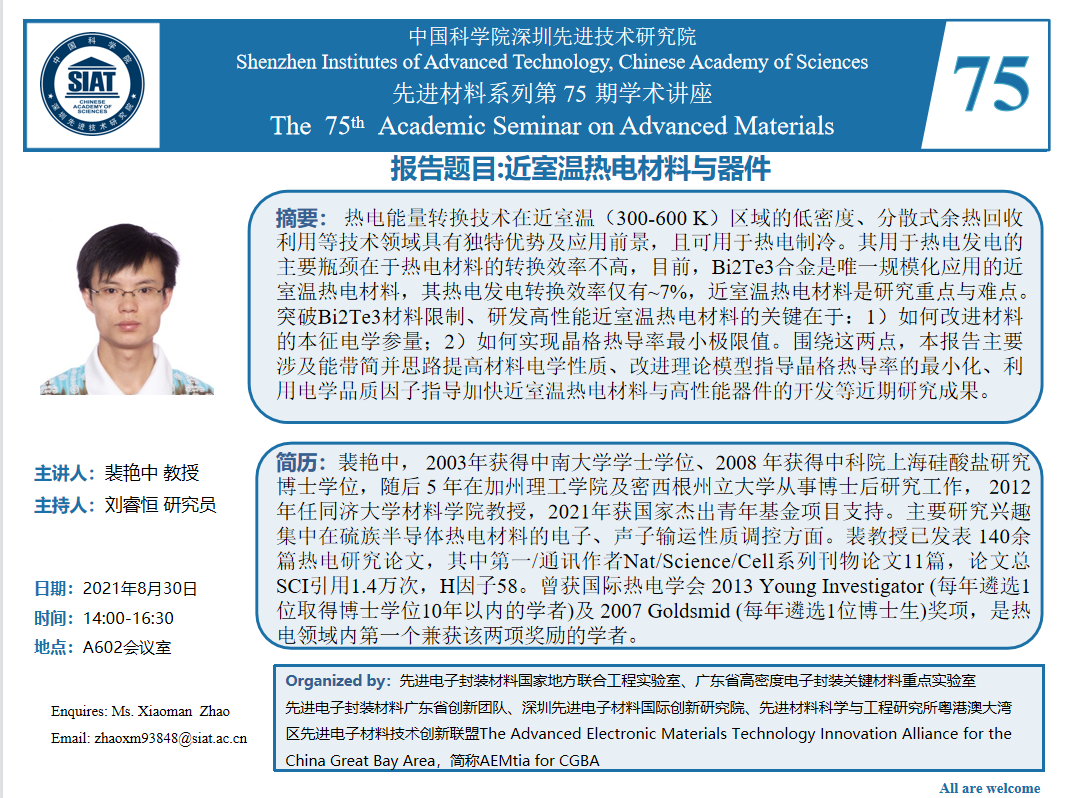 先进材料科学与工程研究所“先进材料系列”第75期学术讲座将于2021年08月30日(周一)14:00-16:30 在A602会议室进行。
