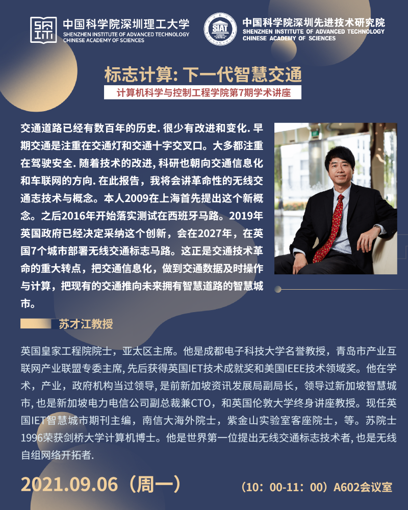 大家好!深理工计算机科学与控制工程学院,第7期学术讲座将于9月6日10:00-11:00在A602会议室举行,本次讲座将邀请英国皇家工程院院士,亚太区主席苏才江教授进行题为“标志计算: 下一代智慧交通”的报告。诚挚邀请大家参加、学习和交流!