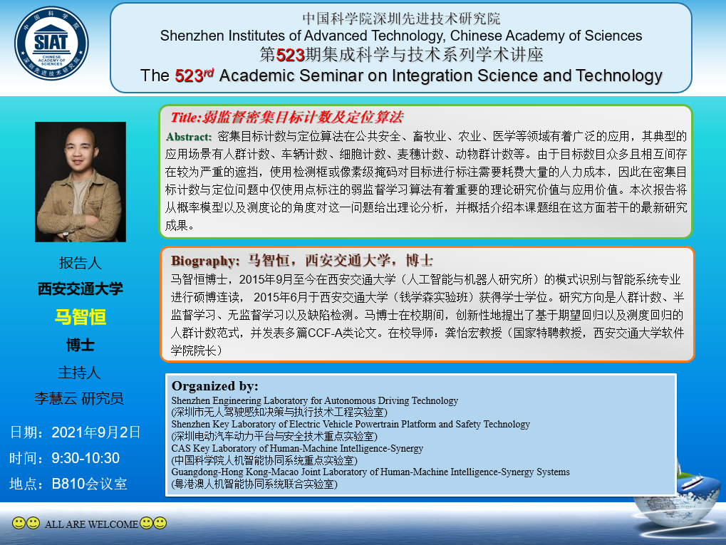 集成所第523期集成科学与技术系列学术讲座将于9月2日(周四)上午9:30-10:30在B810会议室召开。本次讲座特邀西安交通大学的马智恒博士作题为《弱监督密集目标计数及定位算法》的学术报告。
