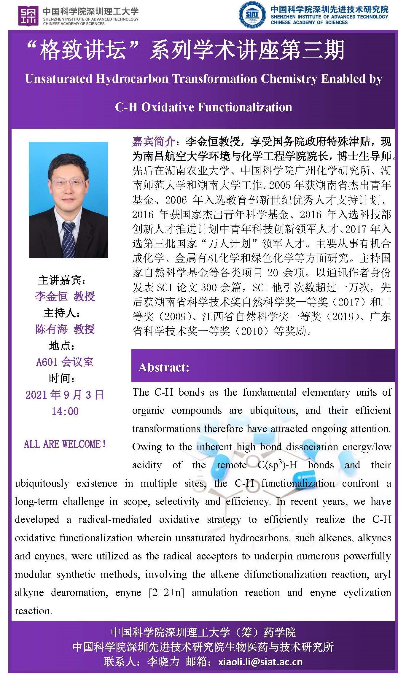 药学院/医药所“格致讲坛”系列学术讲座第3期来啦!“格致讲坛”系列学术讲座第3期学术讲座将于2021年9月3日 星期五 14:00-15:00在先进院 A601会议室举行。本次讲座邀请了来自南昌航空大学环境与化学工程学院,李金恒 教授带来“Unsaturated Hydrocarbon Transformation Chemistry Enabled by C-H Oxidative Functionalization”的报告。届时,陈有海 院长将主持讲座。