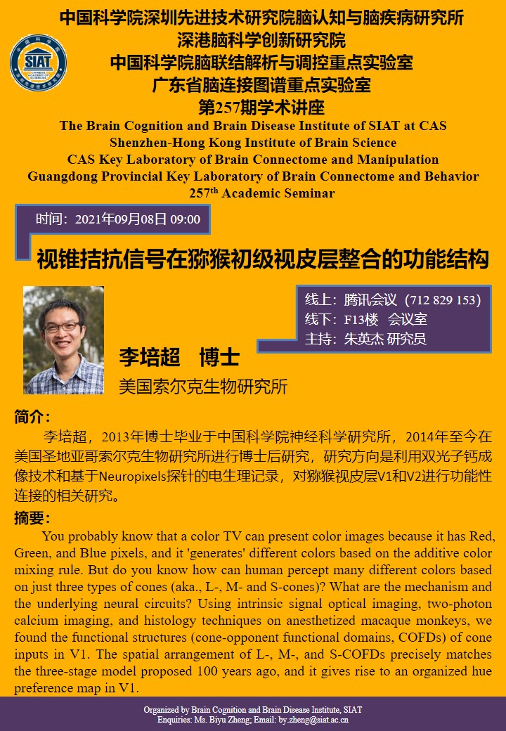 本次讲座由美国索尔克生物研究所,李培超博士作题为“视锥拮抗信号在猕猴初级视皮层整合的功能结构”的专题报告。