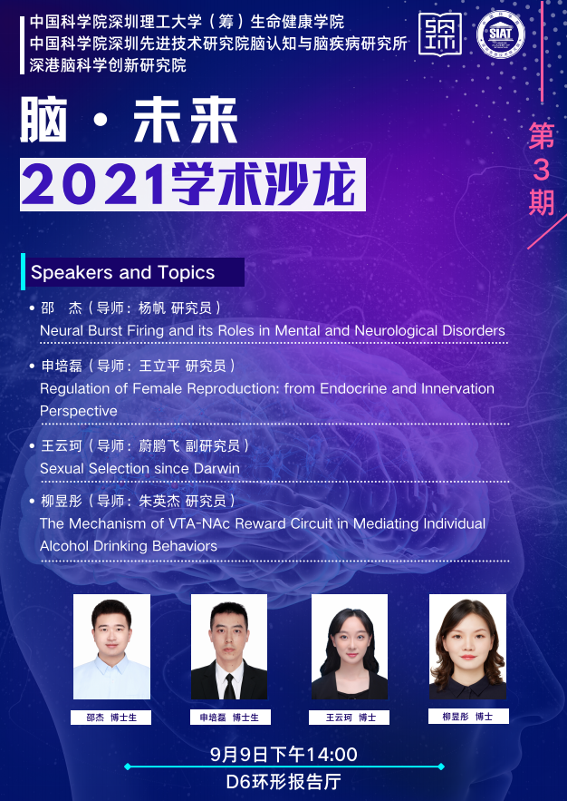 第3期“脑·未来”学术沙龙,将于2021年09月09日14:00,在D6环形报告厅举行。本期活动由中国科学院深圳理工大学(筹)生命健康学院,中国科学院深圳先进技术研究院脑认知与脑疾病研究所,深港脑科学创新研究院联合举办。